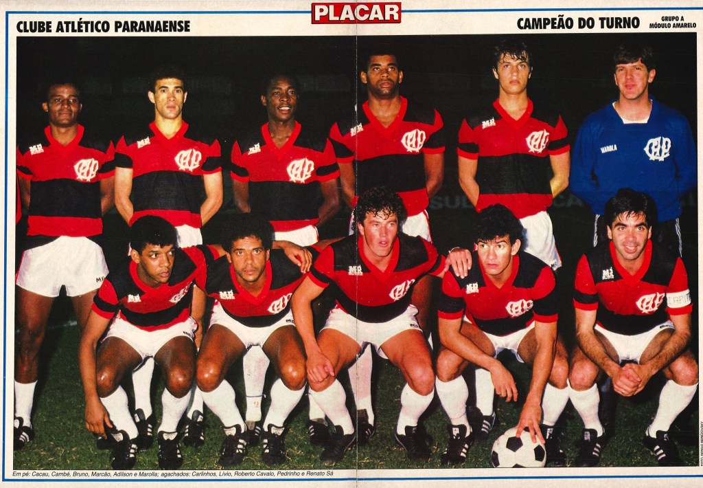 Atlético (Curitiba, PR), no ano de 1987, equipe que conquistou o primeiro turno do então denominado Módulo Amarelo do Campeonato Brasileiro (Copa União). Pôster publicado pela Revista Placar, acervo do pesquisador Jefferson de Lima Sobrinho (Londrina, PR).