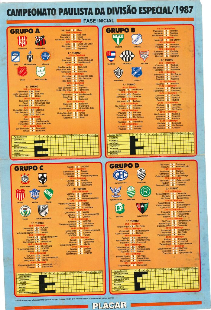 Em 1987 aconteceu a disputa da Copa União ao invés do Campeonato Brasileiro, uma cisão entre a CBF e o Clube dos 13, causou a mudança no que estava previsto para a disputa naquele ano. Assim, os ditos 13 grandes clubes mais 3 convidados formaram o chamado Módulo Verde, quem sobrou e estava classificado para a disputa regular, caso houvesse a disputa normal do Brasileiro, foram acomodados no chamado Módulo Amarelo, onde dois grupos de oito times disputaram nos mesmos moldes do Módulo Verde, dois turnos, um fazendo o enfrentamento do Grupo A contra o Grupo B e o outro com a disputa dentro do mesmo grupo. A tabela foi então publicada pela Revista Placar, porém a Portuguesa (SP), inicialmente, não admitiu ser trocada de divisão e não entrou em campo em alguns jogos, sendo estes remarcados, quando a equipe finalmente decidiu participar. Já o América (RJ), de fato não aceitou ser colocado no grupo dos ditos “pequenos”, já que no ano anterior havia conquistado o terceiro lugar, assim a equipe se recusou a jogar e não participou da competição. A tabela é parte do acervo do pesquisador Jefferson de Lima Sobrinho, publicada na Revista Placar.